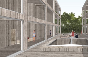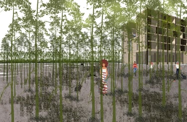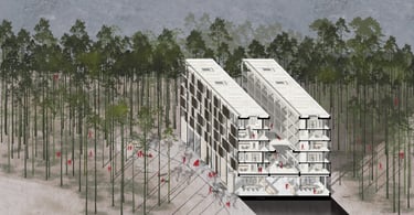 The design process starting with the location of a new building in the clearing. Most of the sunlight usually focuses on the afternoon in the summertime, therefore, on the Westside, the building will be placed further to the forest at least 25m as height as the forest to maximize the amount of sunlight. The building is divided into three smaller volumes and arranged with a U shape to get more sunlight for the middle part and create a courtyard as a certain height for enjoying nature as well. Additionally, the housing function will be located on the two sides of the building. In the middle and the ground floor will be used for working area. The routing is designed to work independently between working and living spaces.
